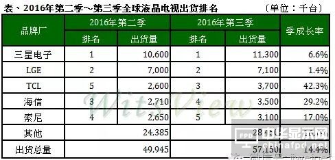Trend Force集邦科技旗下光電研究品牌WitsView最新研究顯示,2016年第三季全球液晶電視總出貨量約5715萬臺(tái),除歐、美市場(chǎng)拉貨力道持續(xù)增溫,加上中國中秋、國慶銷售優(yōu)于預(yù)期及近來中國房地產(chǎn)蓬勃發(fā)展的帶動(dòng)下,季成長(zhǎng)達(dá)14.4%,與去年同期相比也有5.8%成長(zhǎng)。