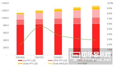 近年來TFT-LCD顯示器件產(chǎn)業(yè)發(fā)展突飛猛進(jìn),產(chǎn)能呈現(xiàn)兩極分化走勢(shì)。一邊是小世代線舊設(shè)備的產(chǎn)能逐步被市場(chǎng)淘汰,韓廠臺(tái)廠陸續(xù)關(guān)閉小世代線的產(chǎn)能。另一邊則不斷有新的產(chǎn)線建成投產(chǎn),主要集中在中國大陸地區(qū)以G8.5代為代表的超高世代線新產(chǎn)能陸續(xù)量產(chǎn),帶動(dòng)G8.5代線產(chǎn)能持續(xù)增長(zhǎng)。從各世代線來看,7代線及以下產(chǎn)線的產(chǎn)能呈現(xiàn)減少趨勢(shì),主要是因?yàn)槿?SDC)等廠商紛紛淘汰7代和5代舊的產(chǎn)能造成產(chǎn)能面積同比增長(zhǎng)。三星(SDC)在2015年四季度關(guān)閉了一條5代線,且已經(jīng)決定在2016年底關(guān)閉其中的一條7代線。而高世代線的產(chǎn)能呈現(xiàn)明顯的增長(zhǎng),尤其中國大陸面板廠京東方和華星光電近年來積極擴(kuò)充G8.5代的面板產(chǎn)能,帶動(dòng)G8.5代產(chǎn)能面積呈現(xiàn)連年同比雙位數(shù)的高速增長(zhǎng)。從2014年到2016年,G8.5代基本上保持每年同比12~13%的幅度增長(zhǎng)。展望未來,依然維持高世代產(chǎn)能高速增長(zhǎng),低世代產(chǎn)能陸續(xù)遭淘汰的趨勢(shì)。中國面板廠CEC和HKC積極規(guī)劃G8.6代線,同時(shí),以京東方和華星光電為首的中國大陸面板廠,將會(huì)進(jìn)軍G10.5超高世代線,帶動(dòng)高世代線產(chǎn)能的持續(xù)增長(zhǎng)。