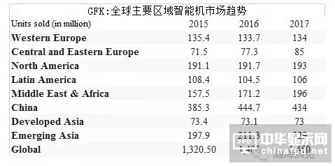2017年全球智能機市場受到宏觀經濟以及政局變化影響較大,根據GFK預估,2017年依據區域來看可劃分三類: