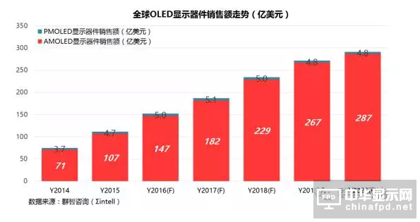 2017年由于全球科技巨頭蘋(píng)果公司將采用AMOLED顯示屏,AMOLED的產(chǎn)能及出貨量將引來(lái)一個(gè)新的增長(zhǎng)高峰,根據(jù)測(cè)算數(shù)據(jù)顯示,預(yù)計(jì)2017年全球OLED顯示器件的銷(xiāo)售額將達(dá)到約187億美金,其中AMOLED顯示器件銷(xiāo)售額約在182億美金水平,而PMOLED顯示器件的營(yíng)業(yè)約在5.1億美金水平。