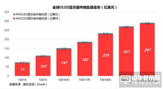 2017年由于全球科技巨頭蘋果公司將采用AMOLED顯示屏,AMOLED的產能及出貨量將引來一個新的增長高峰,根據測算數據顯示,預計2017年全球OLED顯示器件的銷售額將達到約187億美金,其中AMOLED顯示器件銷售額約在182億美金水平,而PMOLED顯示器件的營業約在5.1億美金水平。