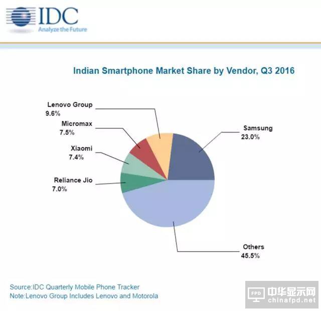IDC報告顯示,第三季度,三星以23%的市場份額在印度智能手機市場上獨占鰲頭,環比增長8%,同比增長9.7%。聯想集團(包括摩托羅拉)躍居印度智能手機市場第二,市場份額為9.6%。小米首次躋身印度智能手機市場前五名,排名第四,出貨量較上季度翻了一番。而印度本土的Micromax智能手機出貨量較上季度下降了32%,下滑至第三位。