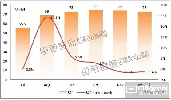 BOE、CSOT在32英寸液晶面板的出貨量非常高,32英寸液晶面板從7-12月份一路上漲,最大漲幅達到10多美元,雖漲幅均價不大,但在規模化產能,收益是非常可觀。