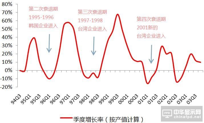 圖1:回顧液晶周期1994-2003,韓企、臺(tái)企反周期投資趕超技術(shù)領(lǐng)先的日本企業(yè)