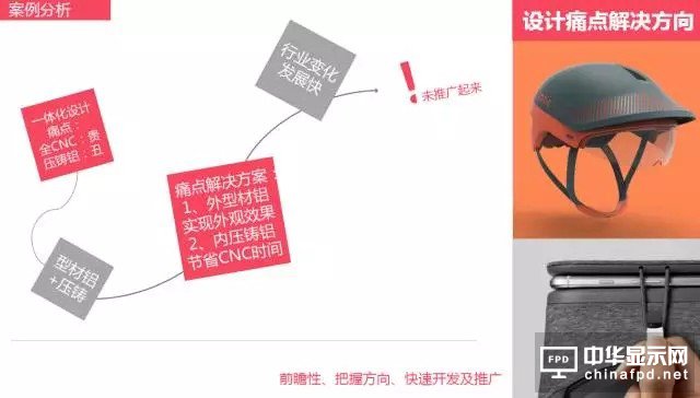 在演講的最后,董建春老師從CMF設計痛點方面分析了一個實際案例,講述了全CNC和壓鑄鋁到外型材鋁和內壓鑄鋁的結合課題。