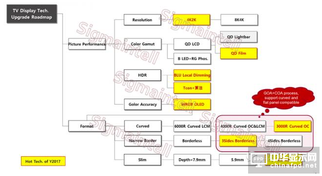 近期對于外觀的創新最主要是在模組端推進技術革新,但必須要面板積極配合。從面板端來看,曲面面板以三星(SDC)和友達為主要陣營,2016年中國廠商華星光電也加入曲面面板供應,帶動曲面面板的供貨能力大幅增強。2017年面板廠商會持續的推動COA及BCS等制程改造,改善曲面面板的畫質,曲率也會進一步升級,帶動3000R曲率實現全面應用。同時主流面板廠商將擴大推廣平曲共用的open cell,使得曲面電視成本下降,促進需求增長。