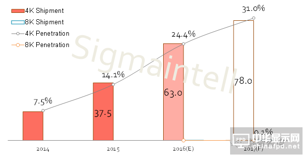 2014~2017全球4K&8K液晶電視面板出貨量及滲透率走勢(單位:百萬臺,%)