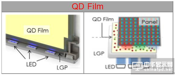 背光技術對LCD畫質起著至關重要的作用。量子點背光是以量子點(Quantum Dot)做為發光材料,通過藍光LED來調節量子點的尺寸大小,進而控制能帶和發射光譜,可以大幅提高傳統背光的光譜。因此,用量子點膜(QD Film)來取代傳統TV背光中的diffusersheet,就可以大幅提高TV的顯示色域到100%以上。這極大彌補了LED背光在色域上的天然不足,對TV整機廠商具有極大吸引力。