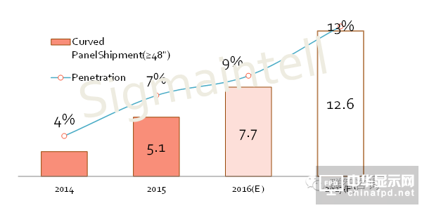 根據群智咨詢(Sigmaintell)預計2017年全球曲面面板的出貨量將會達到1400萬臺,滲透率提升到5.6%。其中,48及48英寸以上的大尺寸曲面面板出貨量預計為1260萬片,滲透率達到13%。而隨著曲面面板資源不斷豐富,供應能力不斷提升,成本繼續下降,群智咨詢(Sigmaintell)認為未來幾年內曲面電視規模依然有較大的提升空間。