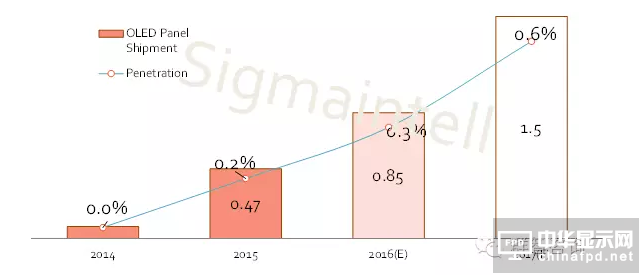 OLED電視在適應薄型化趨勢的同時,實現了卓越的畫質,在高端電視消費市場引起關注,也被認為是下一代顯示產品的代表。但是OLED電視受制于面板供應端產能少,良率較低及成本高的影響,規模無法在短期內迅速擴大。目前OLED電視面板主要由LGD獨家供應,中國廠商BOE也有涉及,但是尚無法規模量產。LGD 2017年會繼續改造LCD,將部分產能轉換成OLED制程,由此會帶來OLED電視面板產能供應能力提升。根據群智咨詢(Sigmaintell)預計,2017年得益于產能擴充以及良率的提升,OLED電視面板的出貨數量預計為150萬臺,滲透率提升到0.6%,依然比較低。