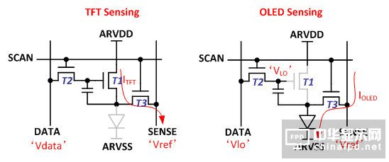 它有兩種抽取電信號方式,一種是抽取TFT電流,被稱作TFT sensing,一種是抽取OLED電流,被稱作OLED sensing。基本原理都是給定TFT或OLED的驅動電壓,把電流從感應線傳抽取到驅動IC,如下圖所示