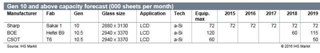 CSOT的T6將于2019上半年量產(chǎn),其第一階段每月產(chǎn)能為60,000片。日后會(huì)再擴(kuò)建到每月140,000片玻璃基板投入產(chǎn)能,這兩家10.5代線工廠的第一階段產(chǎn)能總和將是目前夏普10代線工廠產(chǎn)能的2.7倍。如下圖所示。