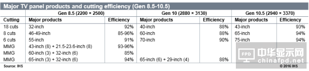 以下為IHS科技所分析在不同世代(8.5代, 10代與10.5代)的不同尺寸經(jīng)濟(jì)切割以及玻璃基板利用率。