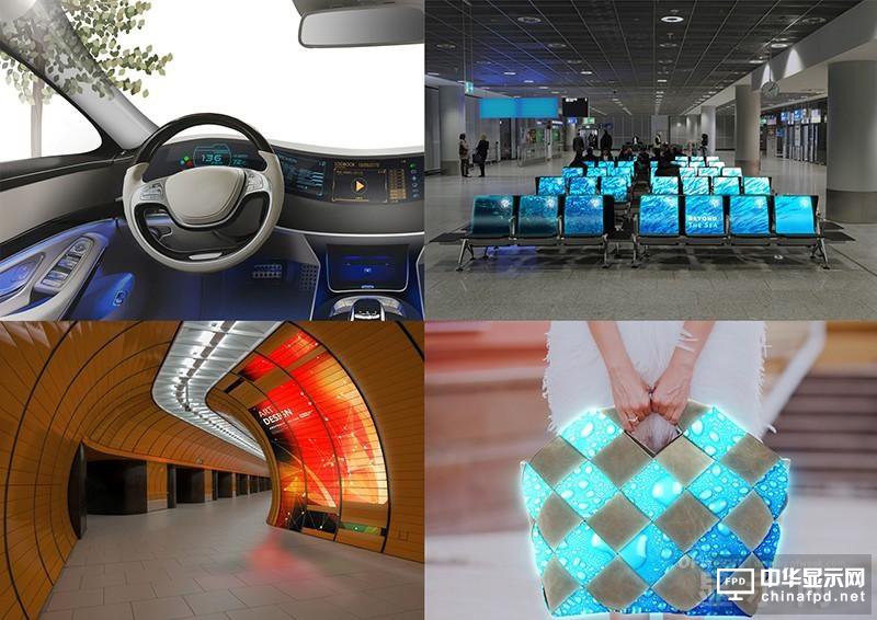 圖為有機(jī)液晶顯示屏(OLCD)應(yīng)用在汽車(chē)、數(shù)字標(biāo)牌和時(shí)尚產(chǎn)品上的效果圖
