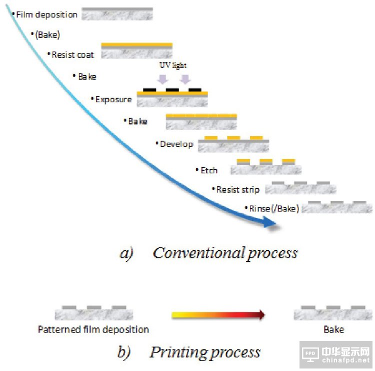 那么是否存在這樣的加工技術,它能夠結合非真空工藝實現低成本,用材少的目標。隨著人們對TFT制造技術的不斷探索,印刷電子技術應運而生。顧名思義,印刷電子技術是將電子材料配成流動性的墨水,像印刷報紙那樣采用印刷的方法大批量地制備各種電子元器件, 這無疑要比傳統的方法經濟得多。圖1將印刷技術與傳統光刻技術進行了比較。從圖中可以看到,印刷技術采用按需滴液的方式,直接形成圖形化的薄膜,這種加成法的工藝與減成法的光刻技術相比,在節省材料的同時能夠大大簡化工藝步驟,減少污染,降低成本。其中,針對金屬氧化物TFT而言,用于在襯底上形成氧化物半導體薄膜的墨水可分為兩大類,分別是溶膠-凝膠(sol-gel)型墨水和納米顆粒型墨水。前者通常是將金屬鹽作為前體溶解在溶劑中得到,后者通常是金屬氧化物納米顆粒在一定條件下均勻分散于溶劑中形成。采用溶膠-凝膠型墨水形成薄膜時,金屬鹽溶液需要進行縮合化學反應,并經過干燥、燒結固化形成金屬氧化物半導體薄膜。納米顆粒型墨水的成膜過程也需要通過高溫使有機溶劑等雜質充分揮發去除,但與溶膠-凝膠相比,納米顆粒可以在相對較低的溫度進行燒結,具有低溫制備的潛力,且納米顆粒型墨水比較穩定。但是其弊端在于形成的薄膜比較粗糙,納米顆粒間的孔隙和有機殘留物阻礙電子傳輸,導致薄膜具有較低的遷移率和較高的電阻。需要說明的是,墨水就是可印刷的溶液,而這種由溶液經過固化成膜的方法通常被稱為溶液法。與濺射的氧化物半導體薄膜相比,采用非真空溶液法制備氧化物半導體薄膜除了低成本的優勢,還能簡單方便地調整各個溶液的配比,從而更加靈活地改變金屬氧化物中各元素所占的百分比。但是,溶液法制備氧化物TFT尚不成熟,器件的性能有待進一步提高。