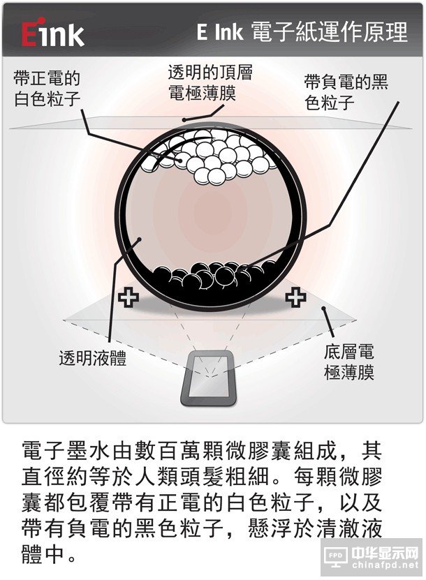 現在用在電子閱讀器的EInk用的多是采微膠囊電泳技術,顯示方式可說是完全不同于常見的液晶顯示技術,其內部主要由大量細小微膠囊(micro capsules)組成,這些微膠囊的直徑比人類頭發直徑還小。微膠囊中有著分別帶正電荷的白粒子和帶負電荷的黑粒子懸浮于液體中。當電場為正時,白粒子便向著微膠囊頂端移動,黑粒子被拉到微膠囊底部,微膠囊就會呈現出白色的畫面;反之施加負電場,就呈現黑色了。