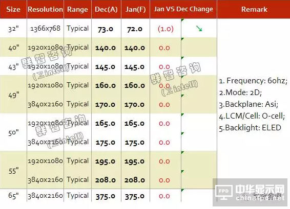 根據群智咨詢(Sigmaintell)調查數據顯示,12月份LCD TV面板市場呈現結構性供需不平衡,面板價格也呈現分化趨勢。1月份為傳統需求淡季,需求轉弱帶動TV面板整體供需趨于寬松,預計價格將全面止漲,32英寸面板價格維持微幅下跌趨勢。各個尺寸價格表現分析如下: