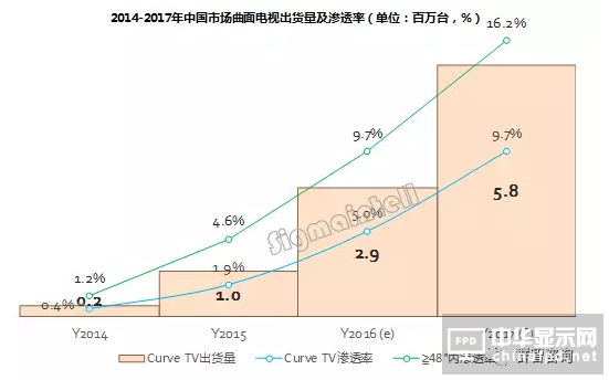 從2013到2016年,曲面電視經過了四年的發展,在很多質疑聲中匍匐前進,通過面板廠和整機廠長時間的堅持和積極推廣,預計2017年將迎來中國市場曲面電視快速成長期。據群智咨詢(Sigmaintell)數據,2016年中國市場出貨規模為290萬臺,滲透率為5%,2017年出貨規模上看580萬臺,滲透率接近10%。