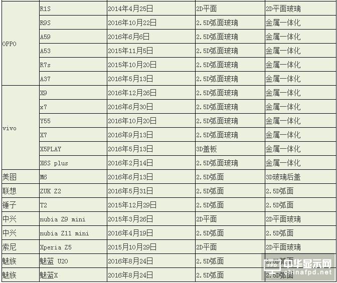 無獨有偶,此處表格統(tǒng)計到的vivo在2016年的新機(jī)也都采用金屬機(jī)身,2.5D弧面玻璃,上半年發(fā)布的vivo X5PLAY采用3D曲面蓋板。