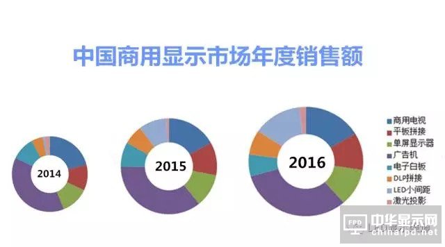商用顯示應用場景一般來講主要是在室內或者半戶外環境,尤其廣告機、數字標牌、室內監控等多個商用顯示領域為重,從上圖,我們也可以看出此前的商用市場份額基本上被LCD屏和DLP拼接屏為主,然而隨著LED小間距產品的快速成熟發展,LED顯示顯示產品所占份額也開始在這個巨大潛力的市場逐漸上升。