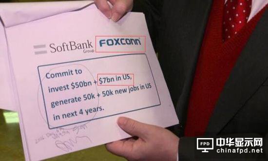 郭臺銘稱,對于要不要去美國建廠,公司已經考慮了良久。但這一想法真正提出來,是在2016年與孫正義一起會見特朗普的時候。會后,孫正義決定在美國投資500億美元。據CNBC報道,特朗普與軟銀會面的文件上出現了蘋果富士康的公司標志,還提到了70億美元投資及新增5萬個工作崗位的內容。但這只是當時的想法,并沒有最終決定。