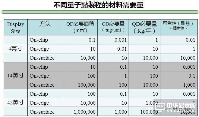 QD在2013年正式進入LCD應用,對促進產業成長備受期待,最大特征在于色域,能超越OLED的鮮明度,而切換OLED的QLED(Quantum-dotLightEmittingDiode)也正在開發中。量子點分別有On-Chip、On-edge、On-Surface這3種制程,再依據Display尺寸不同大小,其制程需求的QD材料需要量。