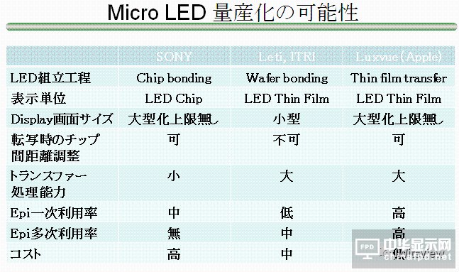 ▲國際大廠Sony、Leti、ITRI、Luxvue(Apple并購),在未來MicroLED量產化的可能性比較。(Source:三建產業信息)