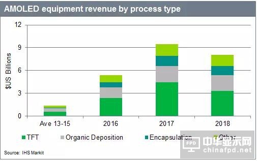 IHS Markit指出,用于生產TFT(薄膜晶體管)基板的設備將占2017年總市場的47%,總營收為44億美元。有機發光層蒸鍍和封裝治具在今年將分別創造22億美元和12億美元的營收。