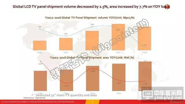 2016年全球TV面板出貨總量接近2.6億臺,數(shù)量同比下降2.5%。從數(shù)量上來講,2016年TV面板出貨是首次出現(xiàn)同比下降。我們認(rèn)為全球TV市場的容量趨于飽和,未來幾年全球TV面板的需求很難再現(xiàn)高速的增長。同時我們也驚喜的發(fā)現(xiàn),TV面板尺寸的增長,也是帶動了面板出貨面積的增長,2016年全球TV面板出貨面積同比增長了7.7%。