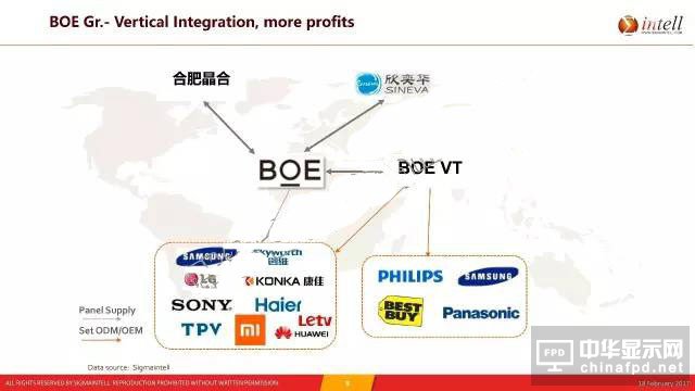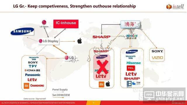 再上升到整個產(chǎn)業(yè)的競爭格局,我們認(rèn)為未來全球顯示產(chǎn)業(yè)會向五大產(chǎn)業(yè)鏈集群聚集,形成比較明顯的寡頭競爭的格局。首先看三星,全球的第一大產(chǎn)業(yè)巨頭。三星的品牌競爭力是很有優(yōu)勢的,近年來SDC在LCD,特別是大尺寸LCD產(chǎn)線逐步關(guān)閉,產(chǎn)能減少,帶動SDC在大尺寸TV面板方面的競爭力逐漸減弱。所以三星電子為了維持自身的競爭力,在供應(yīng)鏈方面平衡資源就必須強(qiáng)化與集團(tuán)外的面板企業(yè)的合作關(guān)系。到目前為止,三星電子與臺灣的群創(chuàng)、友達(dá),中國大陸的京東方、華星光電都是保持比較好的合作關(guān)系。今年三星電子也會開始與LGD展開面板采購的合作。