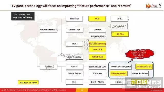 接下來我們看預(yù)測部分,我們先從技術(shù)部分來看,技術(shù)引領(lǐng)市場。未來TV面板會圍繞“畫質(zhì)”的提升和“外觀”的改變?yōu)橹鬏S,并呈現(xiàn)多元化發(fā)展的趨勢。首先從畫質(zhì)的提升來看,主要表現(xiàn)在分辨率的提升、色彩飽和度改善以及搭配量子點(diǎn)、HDR等新技術(shù)來實(shí)現(xiàn)更優(yōu)的畫質(zhì)。4K面板的繼續(xù)普及,8K面板的醞釀,以及QD,HDR等關(guān)鍵技術(shù)已然引領(lǐng)著全球電視面板發(fā)展方向。從外觀來看,主要分兩大主軸,一個是大尺寸化,一個是薄型化。所以TV面板未來會越做越大,越做越薄,同時會搭配曲面,窄邊框、無邊框來實(shí)現(xiàn)更高的產(chǎn)品定位。