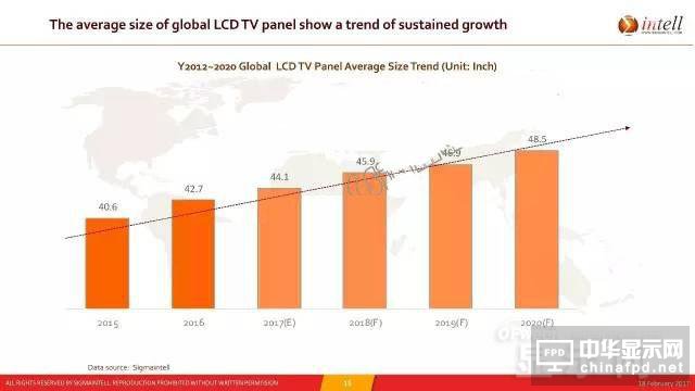 在TV面板行業(yè)近期有兩大熱點(diǎn),一是大尺寸化,二是面板價格大漲。大尺寸化可以從TV的平均尺寸的曲線看出發(fā)展趨勢。2016年,根據(jù)我們?nèi)褐亲稍兊慕y(tǒng)計,全球LCD TV面板平均尺寸增長了2.1英寸,大尺寸化的速度在加快。未來幾年,我們預(yù)計大尺寸化進(jìn)程會繼續(xù)推進(jìn),當(dāng)然速度每年不同。