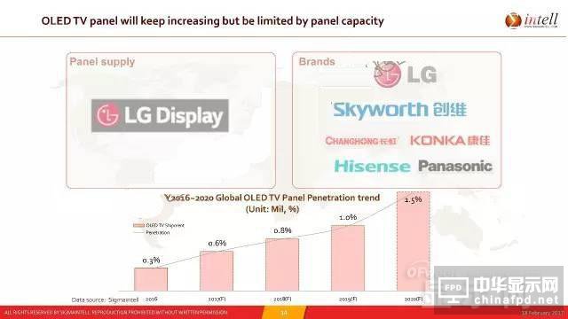 再來看OLED TV。OLED TV面板目前僅有LGD一家面板廠可以量產(chǎn)供應(yīng)。到目前為止,OLED TV面板的生產(chǎn)依然受到良率、成本等方面的影響,獲利比較艱難。LGD在OLED TV面板的布局上比較平穩(wěn),不是那么積極。所以未來幾年OLED TV面板的出貨也是比較平穩(wěn),不會有滲透率快速明顯的提升。