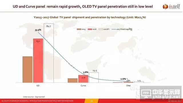 接下來再看不同技術(shù)應(yīng)用的發(fā)展趨勢。首先看UD面板。我們?nèi)褐亲稍冋J(rèn)為在大尺寸化的趨勢下,UD面板出貨會持續(xù)呈現(xiàn)快速增長的趨勢。根據(jù)群智咨詢的最新預(yù)測數(shù)據(jù),2017年全球UD面板的出貨量會超過8000萬臺,滲透率接近40%。
