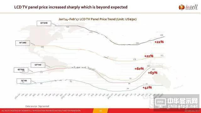 另外一個大熱點(diǎn),就是2016年二季度開始,TV面板呈現(xiàn)大幅上漲的趨勢。這張圖是2014年1月到2017年2月TV面板的價格走勢。我們看到,從2016年二季度開始,全球TV面板開始步入新一輪上漲通道,特別是中小尺寸TV面板的上漲幅度尤為明顯。32英寸在這一階段的漲幅在40%以上;40英寸尺寸段,包括40、43英寸,面板的漲幅超過了60%;大尺寸漲幅則為20%左右。特別值得注意的是,目前40英寸尺寸段價格已經(jīng)超過上一波價格調(diào)整前的峰值。這種價格的快速上漲給品牌廠商的生產(chǎn)成本和獲利帶來非常大的壓力,逼迫品牌廠商推動電視終端市場價格輪番上漲。我們認(rèn)為,價格的持續(xù)上漲最終會對面板未來的市場需求產(chǎn)生不利影響。