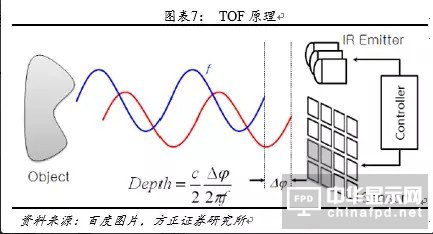 2)TOF(Time Of Flight,飛行時(shí)間)。通過(guò)專有傳感器,捕捉近紅外光從發(fā)射到接收的飛行時(shí)間,判斷物體距離。