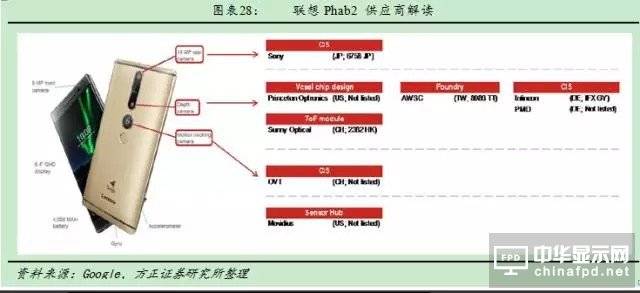 由于PrimeSense被蘋果收購(gòu),Google在Phab 2 Pro改用TOF技術(shù)進(jìn)行3D 成像,設(shè)有三種攝像頭:最上方一顆是三星的1600萬(wàn)像素RGB CMOS攝像頭,用于常規(guī)拍照;最下方是OV魚眼鏡頭,用于動(dòng)作捕捉;兩者之間則是TOF系統(tǒng)構(gòu)成,有上方的Princeton提供的IR VCSEL,和下方英飛凌及pmd共同提供的IR Depth sensor。這三顆攝像頭模組均由大陸模組廠商舜宇光學(xué)提供。