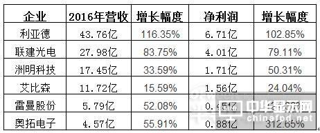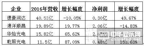 但從營收角度來看,德豪潤達以40.53億暫列頭名,澳洋順昌次之,華燦和乾照光電分居三、四位;然而德豪潤達的盈利能力卻是最弱,以凈利0.3億元墊底,而華燦光電以2.67億元成為“獲利王”,澳洋順昌和乾照光電占據二、三位。