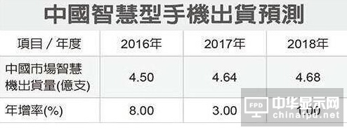 根據(jù)野村證券估算,中國智能機(jī)當(dāng)?shù)厥袌?chǎng)出貨量將從2016年的4.5億支,提升到今、明年的4.64與4.68億支,絕對(duì)數(shù)值雖有增加,年增率卻從8%,下滑至3%、1%,顯示中國智能機(jī)市場(chǎng)增長明顯減速。