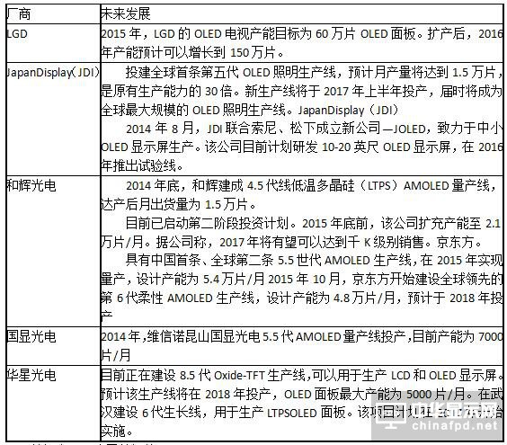 LGD將發展重心放在電視面板的開發上,在大尺寸AMOLED領域尋求突破,日本JDI目前也已經開始建設6代OLED面板生產線,預計將于2018年量產。