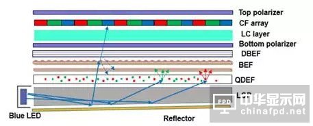 另外補(bǔ)充一點(diǎn),QDEF連擺放位置都很計(jì)較,為了讓光在層層光學(xué)膜中旅行時(shí),重復(fù)反射通過(guò)QDEF的次數(shù)增多,所以QDEF還得放在離光緣最近的地方,一但順序往上移,紅綠光的轉(zhuǎn)換不足,就會(huì)造成偏藍(lán)的現(xiàn)象。