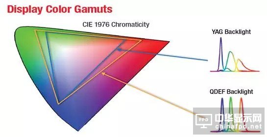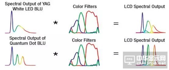 即使量子點(diǎn)電致發(fā)光的研究很早就開(kāi)始,但發(fā)展的很緩慢,實(shí)現(xiàn)量產(chǎn)水平的顯示應(yīng)用就轉(zhuǎn)到了光致發(fā)光,承襲原有的LCD系統(tǒng),利用量子點(diǎn)的特性將單一波長(zhǎng)的藍(lán)光轉(zhuǎn)換成紅光與綠光,取代原本白光LED采用的熒光粉,進(jìn)而達(dá)到廣色域的效果。