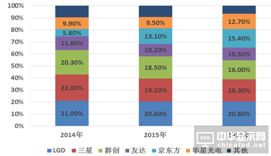 從出貨面積上看,2015 年京東方面板出貨面積占比只有 8.3%,2016 年上半年已 經大幅提升至 13.6%,華星光電 2015 年上半年的出貨面積僅有 5.1%,2016 年 上半年已經達到 7.8%,中國大陸的面板廠正在以兩位數的平均增速擴充產能并 轉化為實際的出貨量和出貨面積。另一方面雖然韓國、日本、臺灣的市場占有率 在逐步降低,但是部分韓國及日本廠商的策略已經偏向大尺寸高清面板和 AMOLED 市場,高端液晶面板產能進一步向中國大陸集中。