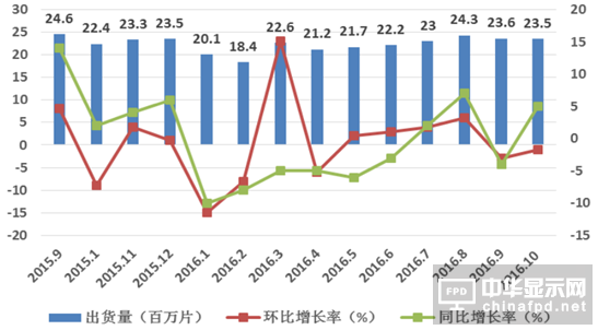 2015 年9月-2016 年10 月全球電視面板出貨量和增長率