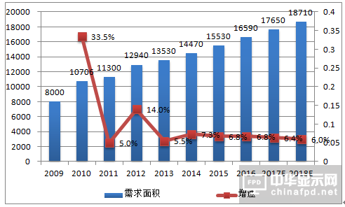 全球 LCD 面板需求面積(萬平方米)及增速(%)