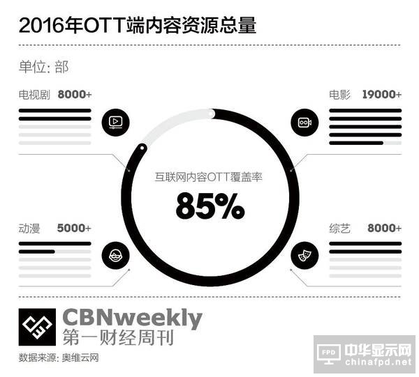 最終,徹底的民資破局,借助的是OTT TV(Over-The-Top TV,即互聯網電視)模式,利用互聯網給電視用戶傳輸內容。根據奧維云網的調查,截至2016年12月,互聯網電視的內容資源總量,包括8000多部電視劇、1.9萬多部電影、5000部動漫以及8000多部綜藝節目,覆蓋了85%的網絡視頻資源,而互聯網電視終端設備保有量則超過2億臺,覆蓋了36%的中國家庭。