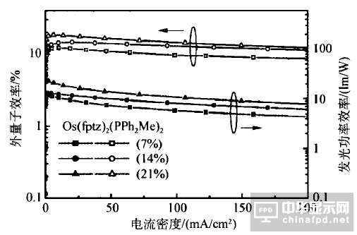 器件“效率滾降”現象也很輕微:在1000 cd/m2照明亮度下, 有18.6%。仍有26.1 lm/W。(fptz) 2Os( PPh2 Me)2的磷光波長略嫌短617nm, 有助于材料避免在高電流密度下“效率滾降”的發生。