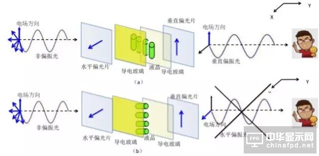 ?。患与妷簳r為「白(White)」或「亮(Bright)」?如圖六(a)所示,在顯示器左側的背光模塊發出「非偏振光」,經過水平偏光片(后偏光片)形成「水平偏振光」,當兩片玻璃板不加電壓時,液晶分子躺在玻璃上,會使水平偏振光的偏振方向旋轉90°,變成「垂直偏振光」,恰好可以通過垂直偏光片(前偏光片),因此形成白(White)或亮(Bright)。由于在沒有外加電壓的情形下我們稱為Normal,因此在沒有外加電壓的情形下是白(White)或亮(Bright)我們稱為「Normal White」或「Normal Bright」。