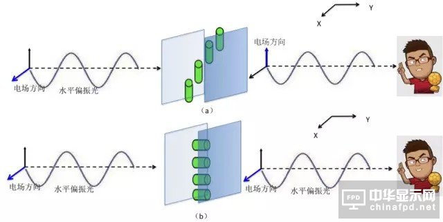 .外加電壓:當兩片玻璃板外加電壓時,液晶分子站在玻璃上,如圖三(b)所示,由圖中可以看出,當「水平偏振光」通過「站在玻璃上的液晶分子」,它的偏振方向會維持不變,保持「水平偏振光」,然后再離開玻璃板。