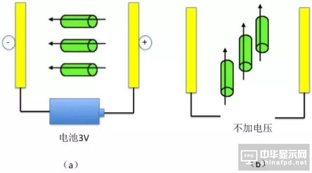 液晶分子為細長型棒狀結構,沿長軸方向具有「極性(Dipole)」,也就是分子的一端帶正電而另一端帶負電,因此當我們對液晶分子外加電壓,會使液晶分子轉動,如圖二所示,我們先將兩片玻璃板互相平行迭起來,再將液晶分子注入兩片玻璃板之間,當我們對兩片玻璃板「不加電壓」或「外加電壓」,液晶分子會有不同的排列情形,換句話說,我們是“利用外加電壓使液晶分子轉動”。